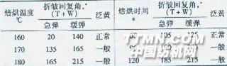 3.2.2焙烘溫度和時間的影響 織物整理時的焙烘溫度和時間是影響整理效果的重要因素。為了獲得較好的抗皺整理效果,分別采用不同的焙烘溫度和時間,對織物進行整理試驗,測定織物的折皺回復角,觀察織物表面的泛黃程度(表3)。 表3焙烘溫度和時間對織物抗皺性能的影響