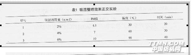 滌綸織物具有成本低,織物強度高的特點,目前用量約占市場的一半,但滌綸織物的吸濕和透氣性差。穿著舒適性難如人意,易產生靜電。在生產使用過程中帶來較多麻煩甚至危害。滌綸織物耐久性親水整理,已是目前提高滌綸吸濕性的重要手段。為此我們利用魯道夫公司的FERANICE吸濕劑從整理的工藝因素和整理方法入手來改變滌綸織物的性能。使之具有天然纖維所特有的舒適透氣性。 目前滌綸耐久性親水劑結構主要為聚酯和聚醚嵌段共聚物。其中聚酯鏈段可以和滌綸產生共結晶。從而使大分子錨在滌綸織物表面。使助劑有較好的耐洗滌性。而聚醚鏈段起到親水的效果。從而使滌綸織物達到穿著舒適性(1)。1實驗1.1實驗材料1.1.1織物:滌綸織物9.8×9.8×390×2801.1.2藥品:德國魯道夫化:[公司FE鼬州ICE,燒堿(分析純),保險粉(分析純),'懶IJJFC。1.1.3儀器:電熱恒溫水浴鍋,毛效測試儀,RJll80高溫高壓染樣機。1.1.4 測試:吸濕效果用毛效測試法,根據織物3 O分鐘毛效的高低,比較吸濕效果。耐洗牢度測試采用,紡織品實驗用家庭洗滌和干燥程序,GB/T86292001。1.2堿浴處理 堿浴處理可以使滌綸產生‘‘堿剝皮’’的效果,改變滌綸纖維的光潔度,使其表面微孔增多,有利于后面的親水整理。但堿浴條件不能太劇烈,以免使滌綸減量過多,改變織物豐格。 處方: 燒堿 2g/L 保險粉l g/L JFC 1g/L 浴比 1:20藝藝流程: 90。C處理20—30min一80。C熱水洗一60。C熱水洗一冷水洗一酸中和一水洗一脫水----烘干。1.3吸濕整理 將織物前處理后,測得毛效平均是3.1cm/30min,采用正交實驗法優選吸濕整理工藝。根據整理的影響因素選擇優擇4因素,每個因素取3個水平,浴比1:20,織