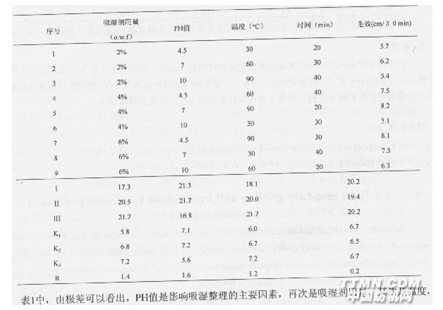 而時間的影響較小。 從實驗結果可以看出,試樣4.5.7吸濕效果都較好,毛效平均增刀口4一孔刪5 U1nln’飩??川口歲。從毛效的大小方面和成本方面衡量,吸濕整理的最適宜的工藝條件是:PH值4.5,吸濕劑用量4—6%’溫度60。C,時l'司40min。