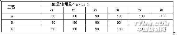 應根據產應品及加工要求采用不同的工藝流程。有時在特定情況下,工藝流程的改變對性能影響不大,如有機氟整理劑T對滌棉染色線絹進行整理,可采用以下三種工藝流程,整理效果見表1。A染色半制品一多浸一軋(軋余率70%)一預烘(95—100℃)一定形(200~205。C×23 S)一焙烘(160—165。C X 3 min).B染色半制品_定形(200205℃ X 23 S)_多浸一軋(軋余率70%)_+預烘(95~100。(2)_焙烘(16c~165℃X 3 min)c染色半制品_÷多浸一軋