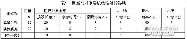 DJ一508是一種磷氯型阻燃劑,由表1可看出,在不影響涂層織物日曬牢度、水洗牢度的情況下,DJ一508具有很好的阻燃效果,而且不會影響織物的拒水性,對出口產品的環保檢測也無影響。
