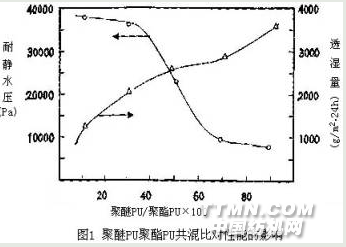 如將二者按一定比例進行共混改性,得“PU高分子合金”,分別制成底涂膠和面涂膠,則可以綜合二者的優點,涂層得到既有優良防水性能,又具有優良透濕性的可呼吸涂層織物。