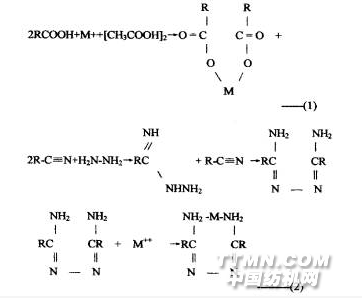采用濃鹼水解方法,使纖維上氰基變為羧基鈉鹽,再用鹽酸酸化為羧基。而后用金屬鹽與之反應,生成金屬絡合物(1),可以獲得很高的限氧指數。但是濃鹼水解的不光是氰基,它也拆斷纖維的長鏈,因此纖維強力下降比較嚴重,如果用水合肼來處理腈綸,氰基與聯氨加成,生成二胺,進而與重金屬螯合(2),獲得阻燃效果,而對纖維的損傷程度,比鹼水解方法小得多。