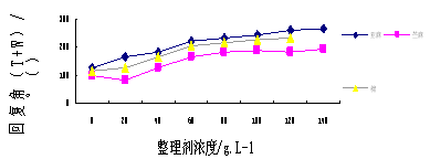 | 圖1 亞麻、苧麻及棉織物回復角與整理劑濃度的關系 |