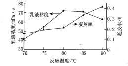 | 反應溫度/℃ | 底液變藍時間/min | 凝膠率/% | 乳液性能 |