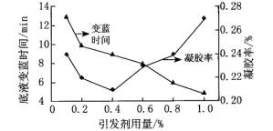 (2)引發劑用量對底液變藍時間及凝膠率的影響引發劑用量對底液變藍時間及凝膠率的影響結果見圖2-6。