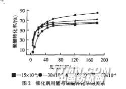 從圖2 可知,其他反應條件同1.2.3 時,隨著催化劑用量的增加,前期轉化率明顯加快,后期趨緩.但是催化劑量增加會使含氫硅油Si—H 鍵脫水交聯的機會增加,聚醚轉化率減小,而且殘留的Pt 使產物由淺黃逐漸變成深黃色.因此,合適的催化劑用量約為30×10-6.