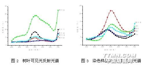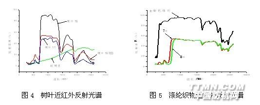 4 結(jié)論 不同樹葉在近紅外線波段的反射光譜具有相似性,在680nm~760nm處反射值急劇增大,但反射能力有所不同。滌綸織物選用適當?shù)姆稚⑷玖先旧螅梢暂^好地實現(xiàn)可見光偽裝,與未染色滌綸反射光譜曲線比較,其反射光譜發(fā)生了紅移,不同染料產(chǎn)生的紅移量是不同的,主要與所選染料的極性基團的種類及染料的結(jié)構有關。拼色的滌綸織物,其反射光譜與紅移量最大的一種染料的反射光譜接近。為了更好地實現(xiàn)近紅外偽裝,必須使滌綸織物染色后產(chǎn)生的紅移與樹葉反射峰相匹配。