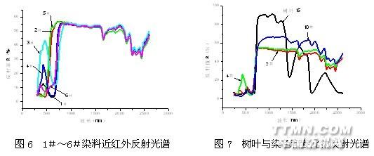 3.5 滌綸織物近紅外反射光譜 圖5是分散染料上染滌綸纖維的反射光譜曲線。由圖5可以看出,未經(jīng)染色的滌綸織物和7#、8#染色樣品的反射光譜曲線非常相似。未染色滌綸在 295~374nm處反射值急劇增大,在267nm處有一小的反射峰,但不明顯。說明滌綸纖維在紫外波段(240~300nm)具有較強的紫外線吸收能力,大約為80%左右。在可見光和近紅外波段(380~2000nm),反射值大約在90%左右,在有效探測波段內(nèi)基本上沒有變化。7#和8#染色樣品的反射光譜曲線基本相同,7#樣品在630~750nm處反射值急劇增大,而8#樣品在688~845nm處反射值突然變大,此后兩條曲線基本重合,表明滌綸纖維經(jīng)分散染料上染后,產(chǎn)生了紅移現(xiàn)象,7#樣品相對未染色樣品來說,紅移了約386nm;而8#樣品紅移了442nm,產(chǎn)生的原因有待今后進一步研究。在近紅外波段(850~1500nm)反射值基本上沒有變化,但反射能力比未染色滌綸下降,約為50%左右,說明滌綸纖維吸附染料后,對可見光和近紅外線有一定的吸收。3.6 不同染料反射光譜 7#、8#樣品分別是用3種染料拼色染成的,為了找出是哪一種染料在近紅外波段起主要作用,把1#~6#染料分別進行染色實驗,并測試其反射光譜,如圖6 所示。可以看出,2#和5#染料反射光譜比較相似,反射值突變位置在425nm~600nm、483nm~700nm處,與樹葉的反射光譜不吻合。1#、 4#染料反射光譜在656nm~760nm范圍內(nèi),反射值急劇變大,從4%增加到52%,與樹葉反射光譜比較接近,這一點可從圖7中得到證實。4#染料和 7#樣品的近紅外反射光譜非常相似,在660nm~1500nm波段,兩條曲線基本重合在一起,可以得知,7#綠色樣品之所以具有類似樹葉的反射特性曲線,主要是4#染料在起作用。此處試樣為染色織物,因此,在740nm~1500nm波段