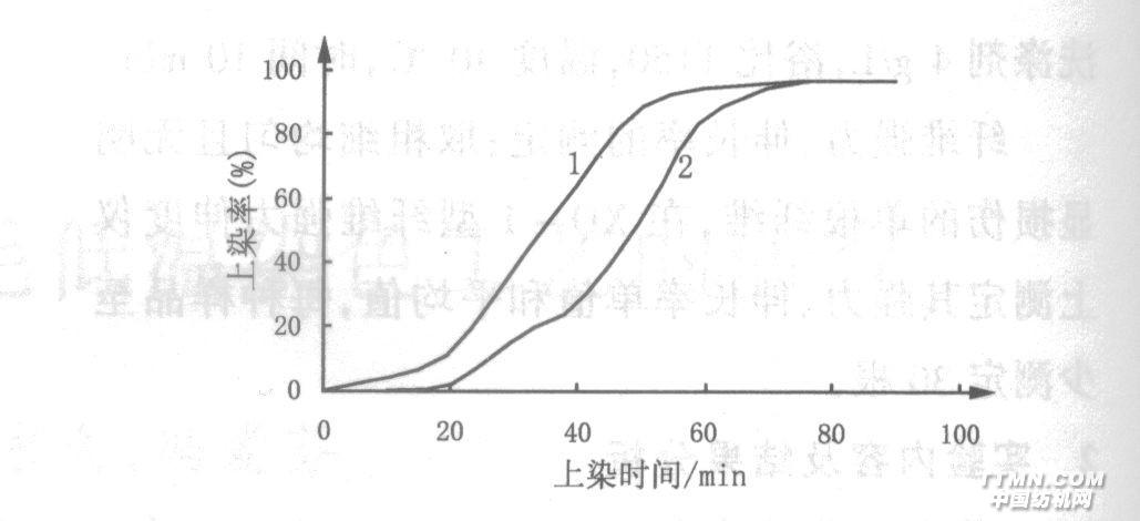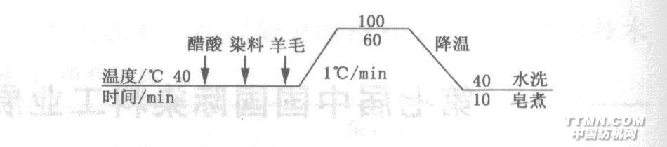 圖2弱酸染料的低溫染色工藝曲線1.3測試方法 上染百分率的測定:用72l型分光光度計測定染色殘液的吸光度,計算上染百分率。其計算公式為:上染率(%)=(1-)×100式中,E1??染色殘液的吸光值,E0一空白染液的吸光值,N??染色殘液的稀釋倍數,M??空白染液的稀釋倍數。 皂洗牢度的測定:采用測定染色皂洗后皂洗掉色量來評判皂洗牢度的高低。皂洗條件為絲毛洗滌劑4 g/L,浴比1∶50,溫度40℃,時間10 min。纖維強力、伸長率的測定:取粗細均勻且無明顯損傷的單根纖維,在XQ?l型纖維強力伸度儀上測定其| 染料種類及用量 | WMJ用量(%,owf) | ||||