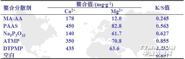 注 : Na5P3O10為多聚磷酸納,ATMP為氨基三亞甲基磷酸,DTPMP為二乙烯三胺五亞甲基磷酸。從表3可知,馬來酸-丙烯酸共聚物(MA-AA)的K/S值最小,因此抗再沾污性能最好。聚丙烯酸納(PAAS)次之。它們都是羧酸類聚合物,在水中電離成陰離子后有強(qiáng)烈的吸附作用,吸附懸浮在水中的水解染料締合體、低聚物和助劑雜質(zhì)粒子,使其表面帶有相同的負(fù)電荷,產(chǎn)生相互排斥作用,避免了顆粒間積聚、沉積,起到了防沾色效果。