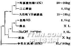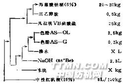 二、操作方法1.將稱好的凡拉明vB藍鹽倒入一桶內,加水進行自然浸泡一晝夜, 不用攪拌, 第二天再加入稱好的麻素及少量水, 進行攪拌, 使其充分溶解。2.將稱好的亞硫馥鋪倒入另一桶內,如水充分攪拌溶解。3.將溶解好的亞硫酸鈉溶液濾入裝有快速攪拌機的大桶內, 加冰塊玲卻至5℃ 以下,開動攪拌機, 在快速拌攪下將溶解好的凡拉明VB 藍鹽液徐徐加入,越慢越好, 一般6O分鐘椰完。繼續攪拌2小時, 使其充分磺化。在攪拌過程中, 磺化反應保持在5℃ 以下,但不低于零下2℃ , 然后取出濾水, 濾水時問不得少于24小時, 濾干備用。三、快磺素黑 、藍、棕印花處方1. 快磺素黑處方: