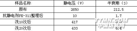 3 結果與討論3.1 抗靜電性滌綸織物原布、抗靜電劑FK-311處理及水洗后的織物抗靜電性能見表一。表一 抗靜電劑FK-311測試數據
