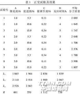 2結果與討論 2.1聚合工藝正交試驗 影響聚合反應的因素有催化劑及促進劑的用量、 鏈調節劑的用量、聚合溫度和聚合反應時間等,考察 4個因素對聚合反應的影響,正交試驗及結果見表1.