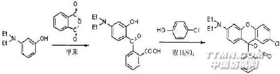 王永安,茅佩卿,程水良,婁紹杰,項(xiàng)斌 0 引言 隨著計(jì)算機(jī)和傳真的廣泛應(yīng)用,對(duì)壓敏記錄紙的需求量急劇增加。目前,全世界壓敏染料年產(chǎn)量約2000t[1]。熒烷類作為第三代壓、熱敏染料,它與三苯甲烷類和內(nèi)酯類敏感染料相比, 具有以下優(yōu)點(diǎn):靈敏度高,發(fā)色密度大,穩(wěn)定性好,在熒烷母體上容易引入不同取代基如烷基、氨基,烷取代氨基、鹵素、羥基、烷氧基、酰基、芳香基、雜環(huán)、苯并環(huán)[1]等等,可以得到各種顏色,特別是黑色的壓、熱敏染料[3],被認(rèn)為是最有發(fā)展前途的[2]。因此廣泛應(yīng)用于熱打印紙、傳真用紙及壓敏記錄紙等方面[4]。在我國(guó),熒烷類壓敏、熱敏染料正在開發(fā)之中,隨我國(guó)經(jīng)濟(jì)的快速發(fā)展,對(duì)此類產(chǎn)品的需求日益增長(zhǎng),市場(chǎng)潛力巨大,此類染料的開發(fā)成功將帶來(lái)不可低估的經(jīng)濟(jì)效益。 目前國(guó)內(nèi)已經(jīng)研制出黑色熒烷類染料,但對(duì)有色熒烷染料的研究的還很少[5]。這些有色熒烷染料廣泛應(yīng)用于示溫涂料、示溫墨水、熱敏服裝、熱敏防偽,且生產(chǎn)工藝簡(jiǎn)單,價(jià)格低廉,在市場(chǎng)上極具競(jìng)爭(zhēng)力,基于以上原因,我們對(duì)紅色熒烷染料3-二乙氨基-7 氯熒烷進(jìn)行了合成與研究。本文以間二乙氨基苯酚為原料合成KETO 酸,之后再與對(duì)氯苯酚反應(yīng)得到。合成路線如下: