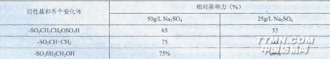 由表一可見染料#2比染料#1的結構少了1個磺酸基,在染色時芒硝用量減少一半,其親和力反應增加了12%,而固著率差不多,若染色時芒硝用量不變,則親和力要增加近60%,固著率則增加了12%,而固著率不多,若染色時芒硝用量不變,則親和力要增加近60%,固著率則提高4.5%;若使染料#2與染料#1的親和力相等或相近,則用染料#2染色時芒硝的用量只要用染料#1染色時芒硝用量的三分之一左右。Sumifix supra E—XF染料就是基于這種三研究開發的低鹽染色用新型活性染料,基染色時用鹽量一般為常規用鹽量的一半。 ii,開發對染色時用鹽量敏感性小的新型活性染料 對上述染料#2深入研究后發現新染料的活性基處于各個變化體時其相對親和力變化不大,而且染色時用鹽量對染色親和力與固著率的影響也不明顯,如表二所示:表2染料#2活性基的變化與其相對親和力及固著率的關系