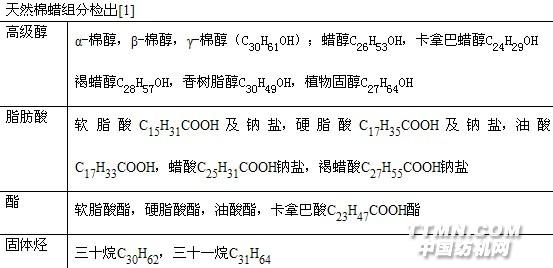 一.纖維柔軟劑的天然模式 棉蠟的柔軟作用是在不同煮煉方法的對比中證實的,亞氯酸鈉煉漂的特點是保留棉蠟的同時不降低毛細效應,其半制品手感要比堿煮煉的好,松軟而豐滿、并且有極好的耐洗性。棉蠟是天然蠟狀物,存在于纖維的初生胞擘中,棉蠟在纖維中的含量一般為0.5-0.65%,從分析中得知,天然棉蠟的組分中有;高級醇,酸,酯及固體碳氫化合物。見下表;