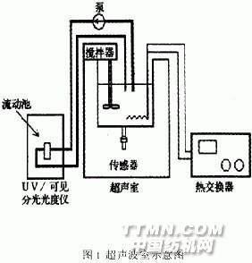 1 實 驗 超聲波發生器(ShinHanUltrosonicsCo.,Korea):28kHz,154W,不銹鋼圓形室,鈦酸鋇壓電傳感器固定在圓形室的底部。產生超聲波氣穴的合適頻率為5kHz~50kHz。為了測試有超聲波和無超聲波照射下染料分散體中粒度的變化,用蒸餾水配制0.05g/l的染料溶液,將染料分散體循環放入UV/可見分光光度儀(Unicam8700,U.K.)中的1cm流動池中,測染料分散體的濁度光譜。圖1所示為儀器的各部件分布。用粒度分析儀(Mastersizer,Malvern,U.K.)在50℃下測有超聲波和無超聲波照射下的粒度變化。
