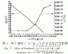 2.2.3 仲丁威對TX-10濁點的影響 仲丁威是一種重要的氨基甲酸酯類農藥,化學名稱:鄰仲丁基苯基甲基氨基甲酸酯,廣泛應用于水稻、棉花和果樹等。圖5是仲丁威增溶在質量分數為1%TX-10時對其濁點及黏度的影響。從圖5中可看出隨仲丁威質量分數增加,體系濁點呈直線下降,黏度開始基本不變,之后迅速增加。這種現象是因為仲丁威增溶在膠束的柵欄層。當仲丁威質量分數低時,膠束體積變化不大,黏度基本不變;當質量分數升高后,膠束體積膨脹變大,促進了膠束不對稱結構形成,體系黏度增加[7],膠束有效碰撞次數增加,膠束更易聚結分相,使濁點下降。