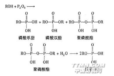 1.3 分析測定1.3.1 磷酸單、雙酯含量的測定[3]準確稱取1~2g樣品于250mL錐形瓶中,加入50mL無水乙醇,充分振蕩使之溶解,滴加2~3滴甲基紅指示劑,用0.5mol/L的氫氧化鈉標準溶液滴定,溶液由紅色變為橙黃色,記錄所消耗的氫氧化鉀標準溶液的體積V1。滴加6~8滴酚酞指示劑,繼續滴定,溶液由黃色變為橙紅色,記錄所消耗的氫氧化鉀標準溶液的體積V2。加入10mL10%氯化鈣水溶液,繼續滴定,溶液由紅色變為橙黃色,記錄所消耗的氫氧化鉀標準溶液的