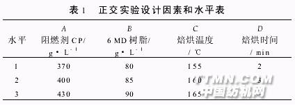 (紡織、紡織產品通用部分)》測試。2 3 整理工藝流程織物→浸軋(含阻燃劑CP、6MD樹脂、催化劑、柔軟劑、滲透劑、尿素、磷酸的整理液,pH4 5~5 4;室溫二浸二軋,軋余率為(85%)→烘燥(3min)→焙烘→水洗→烘干→冷卻。水洗后整理浴的pH值大約為8左右。2 4 正交試驗設計本實驗確定棉織物阻燃劑CP、6MD樹脂、焙烘溫度和焙烘時間為正交試驗的主要因素,探討其對棉織物阻燃性能的影響。為此,設計了4因素3水平L9(34)的正交試驗設計,因素和水平見表1。