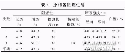 3 結果與討論3 .1 原布性能為更好地比較原布和處理后織物的各項性能,對原布的阻燃性能、極限氧指數、斷裂強力和白度進行了測試,具體數據見表2。