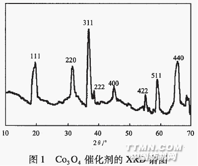 活性染料廢水具有污染物濃度高、色度深、含有許多有毒及致癌物質、難生物降解等特點,易引發許多環境污染問題[1]。處理染料廢水的方法主要有生物法、物理法及化學法[2-5],但往往不能達到滿意的去除效果。目前,使用氧化物半導體的光催化氧化處理方法正受到各國環境科學工作者的廣泛關注,其中,對Ti02,ZnO,Fe,O,等已進行了較深入的研究[6-8]。Co3o4作為重要的金屬氧化物陶瓷材料,被廣泛應用于磁性半導體、氣敏傳感器和鋰離子負極材料等領域[9-12],但對其所具有的光催化活性卻鮮見報道。本工作探討了Co3o4催化劑對B—GFF黑等活性染料(簡稱染料)進行光催化氧化的可行性,考察了Co3o4催化劑加入量、染料質量濃度、染料溶液初始pH等因素對光催化氧化效果的影響。1實驗部分1.1試劑與儀器乙醇、Co(N03)2·6H20、HN03、Na2C03、NaOH、HCl:分析純;K—NR艷藍:新鄉市印織廠提供;B—RN藍、B—GFF黑:新鄉市染織廠提供。D8ADVANCE型x射線衍射(XRD)儀(Cu砭,30kV,30mA):德國BRUKER公司;722型光柵分光光度計:廈門儀器廠;PHS一3C型酸度計:上海大中分析儀器廠;BIO—RADFTS一40型紅外光譜(瓜)儀:美國伯樂公司;光化學反應儀:自制。1.2co3O4催化劑的沉淀一熱解法制備在反應溫度為75℃、反應體系pH為6的條件下,用0.5mol/L的Na2C03溶液與0.5mol/L的Co(NO3)2:溶液在三口燒瓶中進行沉淀反應,得到淡紫紅色沉淀物co2(OH)2CO3,在空氣中陳化后變為紅褐色,過濾,分離出沉淀物,用蒸餾水洗滌沉淀物中的雜質離子,再用少量乙醇洗滌沉淀物至疏松。沉淀物在100oC干燥3h后,在馬弗爐中于300℃煅燒3h得到熱分解產物co