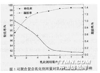 2結果與討論2.1可聚合復合乳化劑用量對乳液聚合穩定性的影響乳液聚合過程的穩定性對乳液制備有重要影響。乳液聚合中,單體聚合反應在增溶膠束中進行,而膠束的數量又取決于乳化劑的用量。為此,本文考察了可聚合復合乳化劑用量對乳液聚合穩定性的影響,結果見圖1。