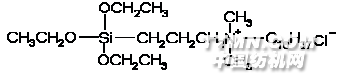 在裝有溫度計、攪拌器、回流冷凝管及氮氣管的四口燒瓶中加入108g(0.36mol)的十八烷基二甲基胺、100g異丙醇、91g(0.378mol)的γ-氯丙基三乙氧基硅烷、適量的碘化鉀、微量抗氧劑,通入氮氣并攪拌升溫至設定溫度,在回流溫度連續反應20~30h;過濾除去不溶性抗氧劑殘渣,減壓回收溶劑及未反應單體,最后得到金黃色透明液體有機硅季銨鹽,檢測產物氨值為0。產物的結構式如下: