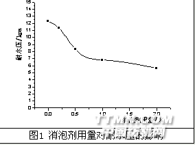 從中可以看出,隨著消泡劑用量的增加耐水壓降低,因此在滿足消泡效果的情況下盡可能減少消泡劑的用量,其用量一般不要超過乳液重量的0.3%。