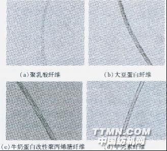 1 試驗部分1.1儀器與試劑儀器 Motic B I型生物顯微鏡,Spectrum One型傅里葉紅外吸收光譜儀(美國PE公司),哈氏切片器,瑪瑙研缽、鑷子和制片器等輔助工具。試劑 石蠟油,硫酸,鹽酸,硝酸,氫氧化鈉,甲酸,冰乙酸,丙酮,二甲基甲酰胺(DMF)等均為分析純;次氯酸鈉(化學純);溴化鉀(光譜純)。1.2樣品聚乳酸纖維、大豆蛋白纖維、牛奶蛋白改性聚丙烯腈纖維和甲殼素纖維的試樣均來源于工廠原料。1.3樣品前處理將試樣平鋪于試驗臺上,用鑷子在不同部位等量鑷取約200 mg纖維。1.4檢測方法1.4.1顯微鏡觀察法依據FZ/T 01057.3-2007《紡織纖維鑒別試驗方法-顯微鏡觀察法》,每個試樣都整理成束,從中等量抽取一小束纖維平行置于載玻片上,加上少量液體石蠟,蓋上蓋玻片。將制成的纖維縱向切片,放在Motic B1型生物顯微鏡的載物臺上,觀察纖維的縱向形態,與標準照片或標準資料對比。得到各種纖維的縱向形態圖,見圖1。1.4.2溶解法依據FZ/T 01057.4-2007《紡織纖維鑒別試驗方法一溶解法》,將100 mg纖維試樣置于25 mL燒杯中,注入10 mL溶劑,在常溫下用玻璃棒攪動5 min(試樣與試劑的用量比為1:100),觀察溶劑對纖維的溶解情況。但對有些在常溫中難溶解的纖維,需要加溫作沸騰試驗,用玻璃棒攪動3 min,觀察其