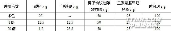 1.方法原理將顏料研磨于一定的介質中,制成樣板,與日曬牢度藍色標準同時在規定的光源下曝曬一定時間后,比較其變色程度,以“級”表示。2.儀器設備 (1)電熱鼓風箱、調墨刀、漆刷或噴槍、馬口鐵板、100目銅絲布、黑厚卡紙、書寫紙、(0~100)μm刮板細度計、1.5 kw氖燈日曬機;(2)天平:感量0.2 g、0.0004 g; (3)小砂磨機:電機轉速:2800 r/min;容器:內徑65 mm,高115 mm;玻璃珠:直徑(2~3)mm; (4)日曬牢度藍色標準(GB 730-65); (5)染色牢度褪色樣卡(GB 250-64); (6)天然日曬玻璃框:以厚約3 mm均勻無色的窗玻璃和木框構成,木框四周有小孔,使空氣流通,并不受雨水和灰塵的影響,曝曬試樣與玻璃間距為(20~50)mm。3.主要試劑 (1)椰子油改性醇酸樹脂:顏色:不大于8(鐵鈷比色計);粘度:25℃時(20~60)s(涂-4粘度計);酸值:不大于 7.5 mg/g;固體含量:(48~52)%。(2)三聚氰胺甲醛樹脂:顏色:不大于1(鐵鈷比色計);粘度:25℃時(60~90)s(涂-4粘度計);酸值:不大于 2 mg/g;固體含量:(58~62)%。(3)涂料用金紅石型二氧化鈦;(4)鉛錳鈷催干劑;(5)二甲苯。4.檢驗步驟(1)試樣的制備 參照表9-12和表9-13,根據顏料品種和所需沖淡倍數,按次序稱取椰子油改性醇酸樹脂、顏料、沖淡劑和玻璃珠,放入容器內,加入適量二甲苯,攪拌均勻并砂磨至細度30 µm以下,再加入所需的三聚氰胺甲醛樹脂及樹脂質量0.2%的鉛錳鈷催干劑,攪拌均勻,用100目銅絲布過濾,以二甲苯調節至適宜制板粘度。表9-12 有機顏料