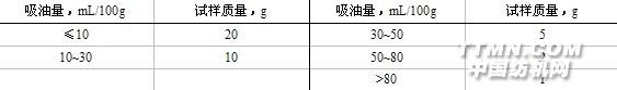 (2)將試樣置于平板上,用滴定管滴加精制亞麻仁油,每次加油量不超過10滴,加完后用調刀壓研,使油滲入受試樣品,繼續以此速度滴加至油和試樣形成團塊為止。從此時起,每加一滴后需用調刀充分研磨,當形成稠度均勻的膏狀物,恰好不裂不碎,又能粘附在平板上時,即為終點。記錄所耗油量,全部操作應在(20~25)min內完成。4.檢驗結果吸油量A以每100 g產品所需油的體積或質量表示,分別用式9-18或式9-19計算:A = 100V/m (9-18)A = 93V/m (9-19)式中: V— 所需油的體積,mL; m — 試樣的質量,g; 93— 精制亞麻仁油的密度乘以100。 報告結果準確到每100g顏料所需油的體積或質量。