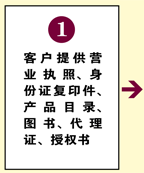 ①客戶提供營業執照、身份證復印件、產品目錄、圖書、代理證、授權書。