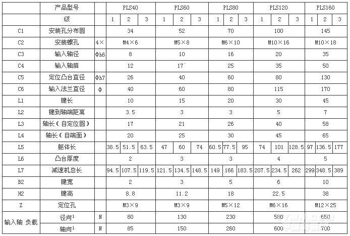 角標(biāo)“1”在輸入轉(zhuǎn)速3000rpm時(shí),使用壽命20000h,作用于輸入軸中心位置(L/2處)之容許徑向力及軸向力