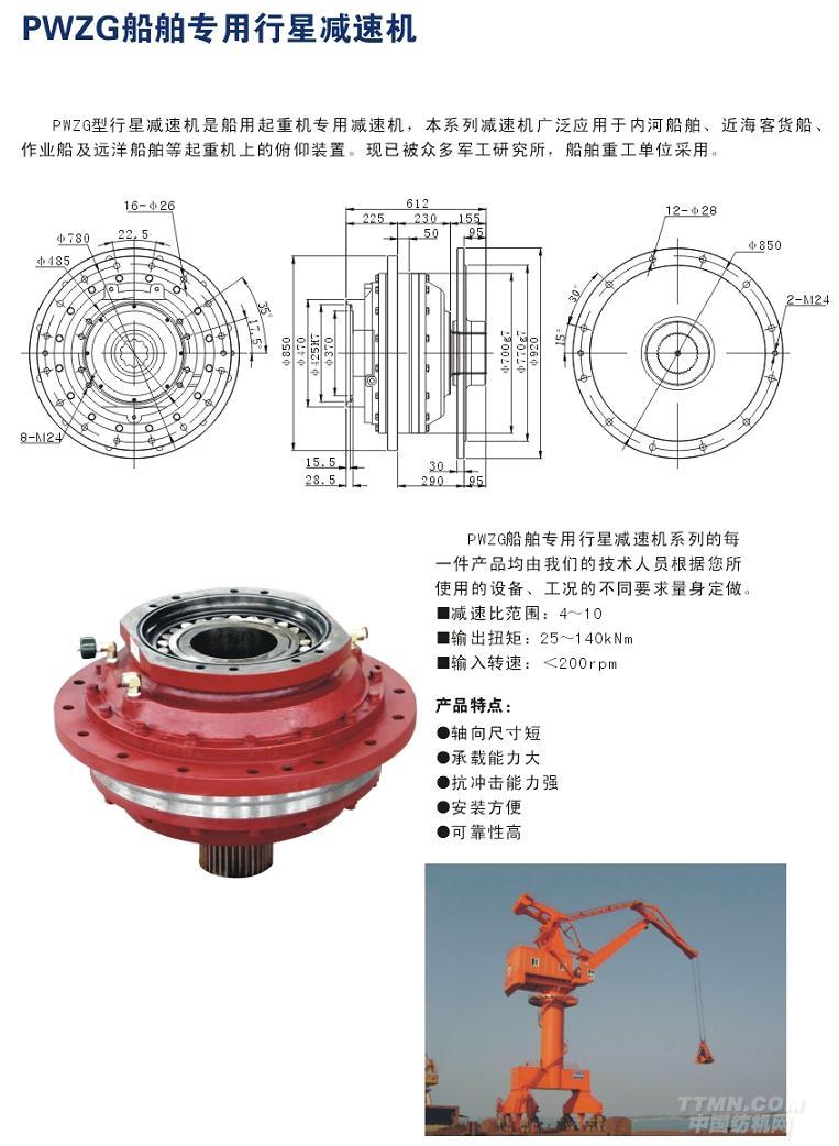 特點:軸向尺寸短、承載能力大、抗沖擊能力強、安裝方便、可靠性高。 應用領域:本系列減速機廣泛應用于內河船舶、近海客貨船、作業船及遠洋船舶等起重機上的俯仰裝置。 技術參數:減速比: 4---100 傳遞力矩: 25KNm---140KNm 輸入轉速:<200rpm 安裝方式: 水平安裝
