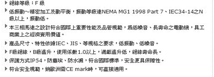 臺(tái)灣高崎立式高效率電機(jī) 產(chǎn)品系列:AEHL/AEUL系列(JIS/CNS系列) 馬力(HP): 1/4HP~100HP(0.18KW-75KW)極數(shù)( P ):2、4、6 電壓( v ):200~460 頻率(Hz): 50、60 框號(hào)(F#): 63~250 保護(hù)方式: IP54 絕緣等級(jí): F 級(jí) ●高效率~提升能源使用效率,比原標(biāo)準(zhǔn)系列損失降低10%~30%,運(yùn)轉(zhuǎn)越久,節(jié)省的電費(fèi)越多。 ●低振動(dòng)~精密加工及動(dòng)平衡,振動(dòng)等級(jí)達(dá)NEMA MG1 1998 Part 7、IEC34-14之N級(jí)以上,振動(dòng)低。 ●本三相馬達(dá)之設(shè)計(jì)符合國(guó)際上重要性能及品管規(guī)范,為低噪音、長(zhǎng)壽命之電動(dòng)機(jī),具工、商業(yè)上之經(jīng)濟(jì)實(shí)用價(jià)值。 ●產(chǎn)品尺寸、特性依據(jù)IEC、JIS、等規(guī)格之要求,低振動(dòng)、低噪音。 ●F級(jí)絕緣,B級(jí)溫升,使用系數(shù)1.0以上,滿載溫升低,絕緣壽命長(zhǎng)。 ●保護(hù)方式IP54,防塵埃、防水濺,符合國(guó)際標(biāo)準(zhǔn),安全更具保障性。 ●符合安全規(guī)范,銷(xiāo)歐洲需CE mark時(shí),可直接適用。 ●高效率馬達(dá)群組系列化,產(chǎn)品齊全符合各國(guó)際法規(guī),具跨市場(chǎng)之泛用性。