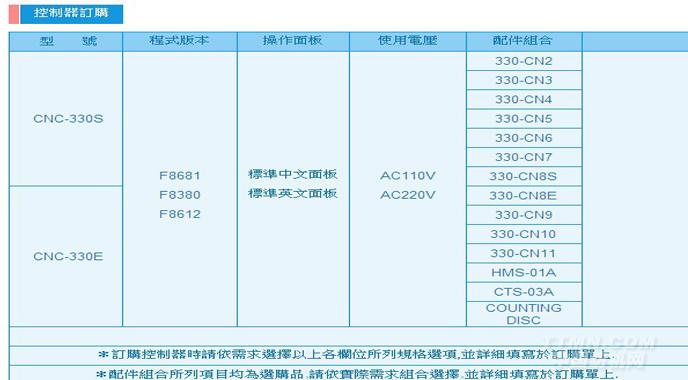 一、臺(tái)麗繞線控制器CNC330是本公司專門為繞線機(jī)開(kāi)發(fā)的功能非常強(qiáng)大的新型微電腦控制器,該產(chǎn)品由從事繞線機(jī)制造行業(yè)的專業(yè)人士開(kāi)發(fā)與設(shè)計(jì),摒棄了傳統(tǒng)LED顯示模式,采用最新大屏幕 LCD 中文漢字顯示系統(tǒng),操作簡(jiǎn)單、直觀,適合繞制復(fù)雜的、步序數(shù)較多的產(chǎn)品,獨(dú)特的文件庫(kù),使用戶繞線資料更方便管理。主控單元采用了大規(guī)?,F(xiàn)場(chǎng)可編程邏輯陣列CPLD技術(shù),性能可靠、工作效率高。CNC-300AS是基于CNC-300A開(kāi)發(fā)的伺服版繞線機(jī)控制器,此新型控制器保留了原版本成熟的技術(shù)與穩(wěn)定的性能,由于直接控制伺服驅(qū)動(dòng)器,精密度和工作效率更高、人機(jī)界面操作更便捷,是自動(dòng)繞線機(jī)理想的選擇。二、主要特點(diǎn)1.大屏幕192×64點(diǎn)陣式LCD,中文漢字顯示。 2.采用CPLD技術(shù),可靠性高、抗干擾能力強(qiáng)。 3.采用 FLASH ROM 能存儲(chǔ) 100 種(999 段)繞線資料,每個(gè)繞線資料分別命名,可隨時(shí)調(diào)用其中任何一種繞線,掉電后資料不會(huì)丟失。 4.只需輸入簡(jiǎn)單參數(shù)即可自動(dòng)生成繞線資料,操作快捷、簡(jiǎn)單,使步序繁多的產(chǎn)品設(shè)置更加方便。 5.具有斷電記憶功能,繞線過(guò)程中突然斷電,可記錄當(dāng)前的狀態(tài)、參數(shù)并保存,待上電,啟動(dòng)繼續(xù)繞制產(chǎn)品,減少原材料浪費(fèi)。 6.繞線軸直接控制伺服驅(qū)動(dòng)器,精度、效率高,加、減速斜率可設(shè)定。 7.排線軸、轉(zhuǎn)角軸步進(jìn)馬達(dá)提供0—99段速度選擇。 8.主軸位置、排線軸參數(shù)可用調(diào)校方式設(shè)定,調(diào)試設(shè)備方便。 9.故障自動(dòng)判別功能,設(shè)定參數(shù)或繞線中產(chǎn)生錯(cuò)誤,自動(dòng)提示錯(cuò)誤位置。 10.兼容性強(qiáng),可直接替代同類型控制器或PLC。 11.程序可提供免費(fèi)升級(jí)。三、技術(shù)指標(biāo)1.繞線資料項(xiàng)目:產(chǎn)品名稱:表示一個(gè)繞線資料名稱,設(shè)定范圍 ≤10個(gè)數(shù)字、英文字符。 步 數(shù):用于指定一個(gè)產(chǎn)品需要幾步繞線動(dòng)用方可完成,每一個(gè)步序包含以下“轉(zhuǎn)速”至“自動(dòng)定位”共14個(gè)項(xiàng)目,可存儲(chǔ)100種繞線資料,共999個(gè)步序,設(shè)定范圍1 — 99步。轉(zhuǎn) 速:高速繞線時(shí)的速度,設(shè)定范圍0 — 9999轉(zhuǎn)/分鐘慢 車:?jiǎn)?dòng)后繞線軸先以低速卷繞的圈數(shù),設(shè)定范圍0 — 999圈。線 徑:線材的直徑,設(shè)定范圍0 — 9.999毫米。加 速:繞線軸由低速上升至高速所需的上升時(shí)間,設(shè)定范圍0 — 9.9秒減 速:繞線軸由高速下降至停止所需的下降時(shí)間,設(shè)定范圍0 — 9.9秒 起 繞 點(diǎn):排線桿原點(diǎn)至繞線點(diǎn)的距離,設(shè)定范圍0 — 9.999毫米。圈 數(shù):所要卷繞的總?cè)?shù),設(shè)定范圍0 — 9999圈,0 — 359.9度,分辨率0.1度。繞 幅:線材卷繞排線的寬度,設(shè)定范圍0 — 9.999毫米。繞線方向:用于指定順時(shí)針或逆時(shí)針繞線,設(shè)定范圍(正時(shí)針/逆時(shí)針)排線方向:用于指定排線的方向,設(shè)定范圍(↑ / ↓) 自動(dòng)啟動(dòng):用于指定執(zhí)行該步序是否要自動(dòng)繞線,設(shè)定范圍(√ / ×) 后 退:設(shè)定排線軸位移至后退位置進(jìn)行轉(zhuǎn)角動(dòng)作,設(shè)定范圍0 — 999.99毫米。轉(zhuǎn)角角度:設(shè)定轉(zhuǎn)角軸步進(jìn)馬達(dá)旋轉(zhuǎn)的角度和方向,設(shè)定范圍0 — ±9999.9度自動(dòng)定位: 保留,設(shè)定范圍(√ / ×)2.工作環(huán)境 電源輸入: 175V—240V 50Hz 2A 環(huán)境溫度: -10℃ — +40℃ 工作環(huán)境: 無(wú)水滴、蒸氣、灰塵及油性灰塵,且通風(fēng)良好。