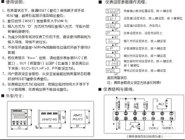 JDM72-6S計(jì)數(shù)、計(jì)米器以人性化、智能型為設(shè)計(jì)理念,內(nèi)含微處理器, 計(jì)數(shù)/預(yù)置數(shù)雙排LED顯示,設(shè)計(jì)先進(jìn)、功能強(qiáng)大、抗干擾能力強(qiáng)、計(jì)數(shù)精度高、讀數(shù)直觀;并具有以脈沖當(dāng)量為系數(shù),設(shè)定對應(yīng)計(jì)數(shù)值(即長度單位)可對計(jì)長精度進(jìn)行精確修正的先進(jìn)計(jì)長、計(jì)數(shù)功能。此外本計(jì)數(shù)器還具有下列先進(jìn)功能: