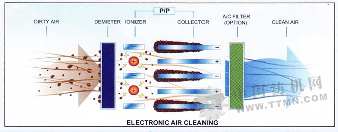 采用高頻、高壓靜電原理,主要是利用陰極在高壓電場中發射出來的電子,以及由電子碰撞空氣分子而產生的負離子來捕捉油煙油霧粒子,使粒子帶電,再利用電場作用使帶電粒子被陽極所吸附,以迭到凈化目的。