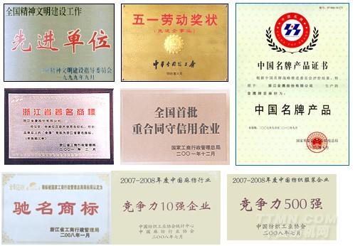 1992年以來,企業被列入"中國500家最大機械工業企業"、"國家機電產品出口基地企業"、"外貿自營進出口企業",連續12年在全國紡機行業綜合經濟指標評比中名列前十強。先后被授予"全國五一勞動獎狀先進集體"、"全國精神文明建設先進單位"、"浙江省最佳經濟效益工業企業"、"浙江省技術進步優秀企業"、董事長傅國定同志于1988年起先后被中華全國總工會、國務院授予"全國優秀經營管理者"、"五一勞動獎章"和"全國勞動模范"。于2001年被國家工商行政管理總局評為 “全國首批重合同守信用企業”。2005年9月,“金鷹”牌桑蠶絹絲,2007年9月“金鷹”牌亞麻紗被國家質檢總局評為"中國名牌"產品。2008年1月,“金鷹”商標被國家工商行政管理總局商標局認定為中國“馳名商標”,2008年7月,公司榮獲中國麻紡行業競爭力10強和中國紡織服裝企業競爭力500強稱號。