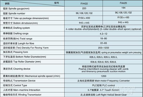 FA422/FA420型懸錠粗紗機結構設計先進性能穩定可靠,成紗質量好,便于操作維護,適用于普梳、精梳棉纖維及棉型化學纖維的純紡或混紡。