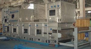 - 預蒸部分:預蒸為橫直導輥型式,主動導布輥采用直徑為φ180多孔輥,分組傳動。設有松緊架調節張力。減速電機為用聯軸節連接,傳動主導布輥,每兩組減速電機為一組,用同一變頻器控制。