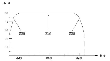 在小紗與大紗時(shí),主電機(jī)由變頻驅(qū)動(dòng),中紗時(shí)由工頻驅(qū)動(dòng)。可有效降低功耗,延長(zhǎng)變頻器使用壽命。