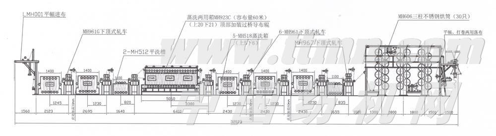 平幅進(jìn)布→MH518蒸洗箱→MH961G軋車(chē)→MH518蒸洗箱→MH961軋車(chē)→MH512平洗槽→MH961軋車(chē)→MH923C汽蒸箱→MH961軋車(chē)→MH518蒸洗箱→MH961軋車(chē)→MH518蒸洗箱→MH961軋車(chē)→MH518蒸洗箱→MH961軋車(chē)→MH512平洗槽→MH961軋車(chē)→MH606三柱烘燥機(jī)→平幅、打卷落布