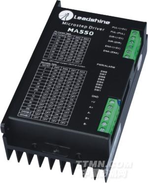 MA550驅動器,可采用交直流輸入,主要驅動57、86型兩相混合式步進電機。其微步細分數有16種,最大步數為51200Pulse/rev;其工作峰值電流范圍為1.0A-5.0A,輸出電流共有8檔,電流的分辨率約為0.5A;具有自動半流,過壓、過流保護等功能。本驅動器為交直流供電,建議工作電壓范圍為18VAC-30VAC,電壓不超過36VAC,不低于16VAC。