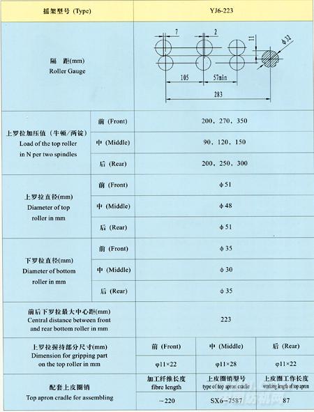 YJ6-223型搖架用于三羅拉雙皮圈牽伸型式的毛紡細(xì)紗機(jī),適紡纖維長度為220毫米以下的毛、化纖的純紡和混紡。