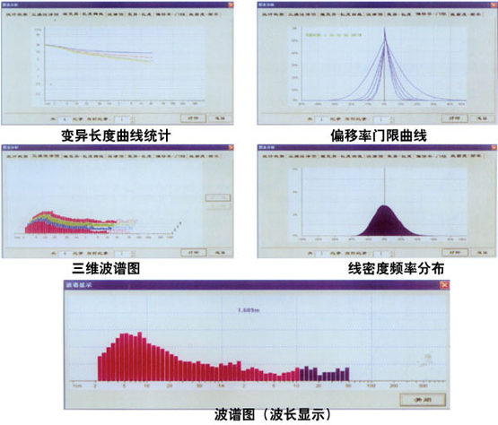 提供單管紗線波譜圖、不勻曲線圖、偏移率門限曲線、線密度頻率分布圖、變異長度曲線圖、綜合統計分析、一組統計波譜圖、一組統計變異長度曲線圖、4檔全部疵點值、AF值、2檔DR值統計、U值、5檔CVm值、CVb、Q95%、千米統計值。