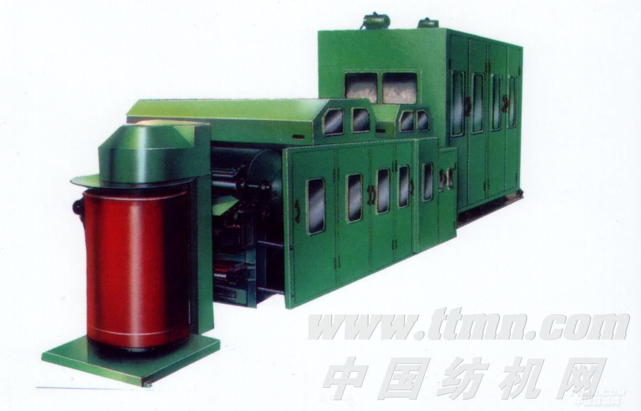 本機利用錫林、工作輥、剝毛輥、道夫之間的表面線速度,針布針向及轉向的各不相同,工作時對人造毛皮原料(化纖)混合開松梳理,制成一定重量的毛條,有規(guī)律地圈繞在條筒內(nèi),供人造毛皮織機或其它工序使用。