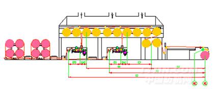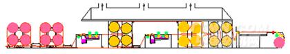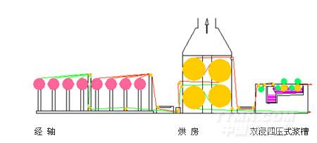 采用高架對角布局預烘烘燥機構(專利號:                    )。由于預烘烘筒位于漿槽的側上方,有效減少了出漿槽濕紗長度,同時節省了設備安裝場地。